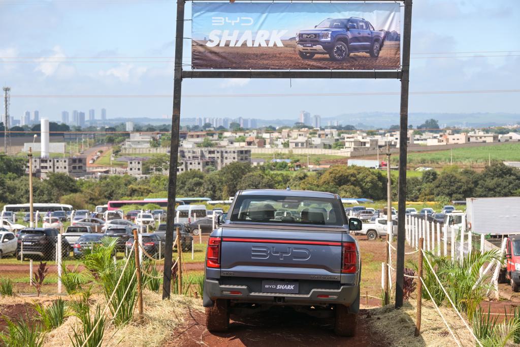 2025年4月29日,正在巴西圣保罗乡镇贝朗普雷图市举行的2025年巴西农业科技展上,一辆比亚迪皮卡进行越野演示。记者 陈昊佺 摄?。