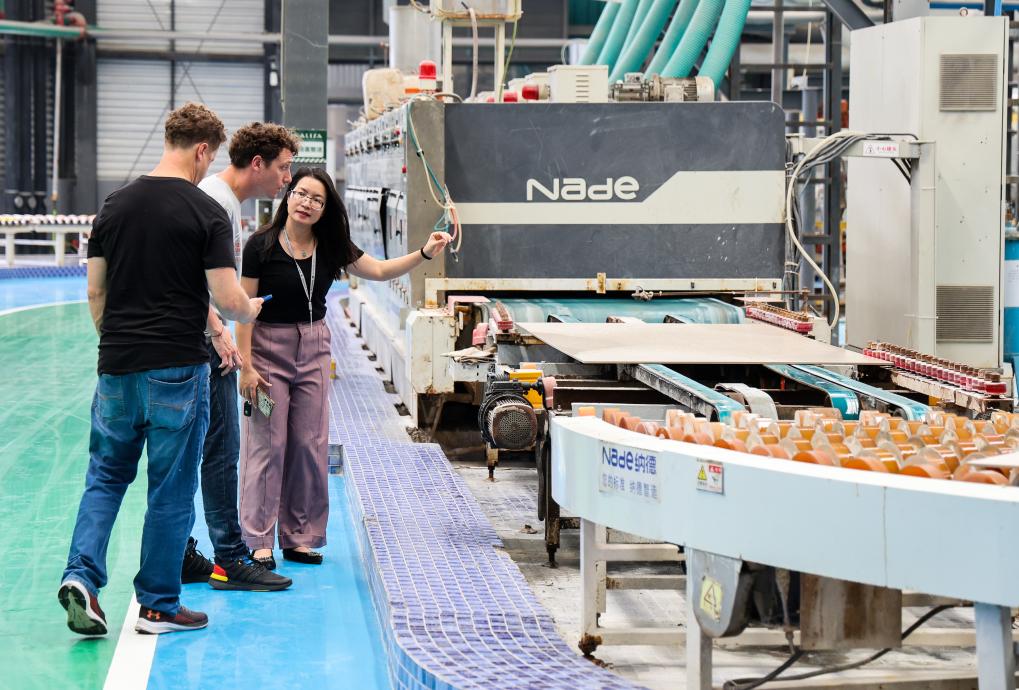 2025年4月22日,两名加入广交会的阿根廷采购商特地来到佛山参不雅蒙娜丽莎大尺寸陶瓷岩板从动出产线。记者 刘大伟 摄!