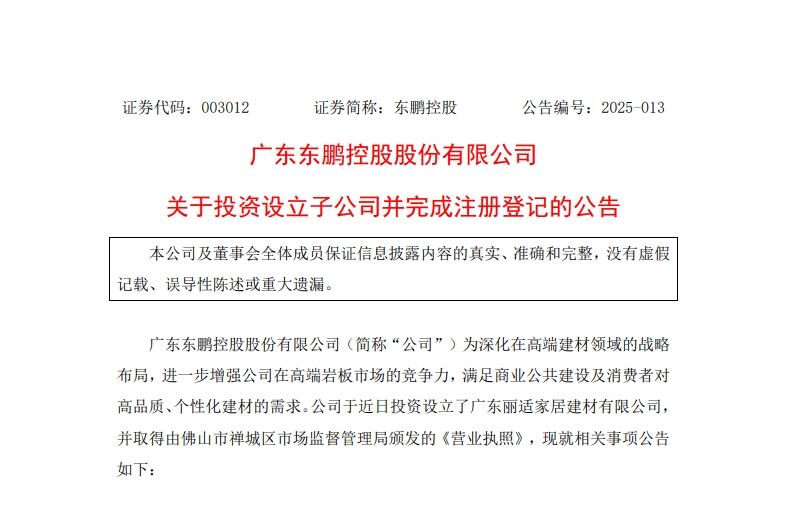 2月24日晚间,东鹏控股发布关于投资设立子公司并完成注册登记的通知布告,内容显示,东鹏取合做方丽适科技配合投资设立广东丽适家居建材无限公司(以下简称“合伙公司”或“丽适家居”),并取得了由佛山市禅城区市场监视办理局发放的《停业执照》。