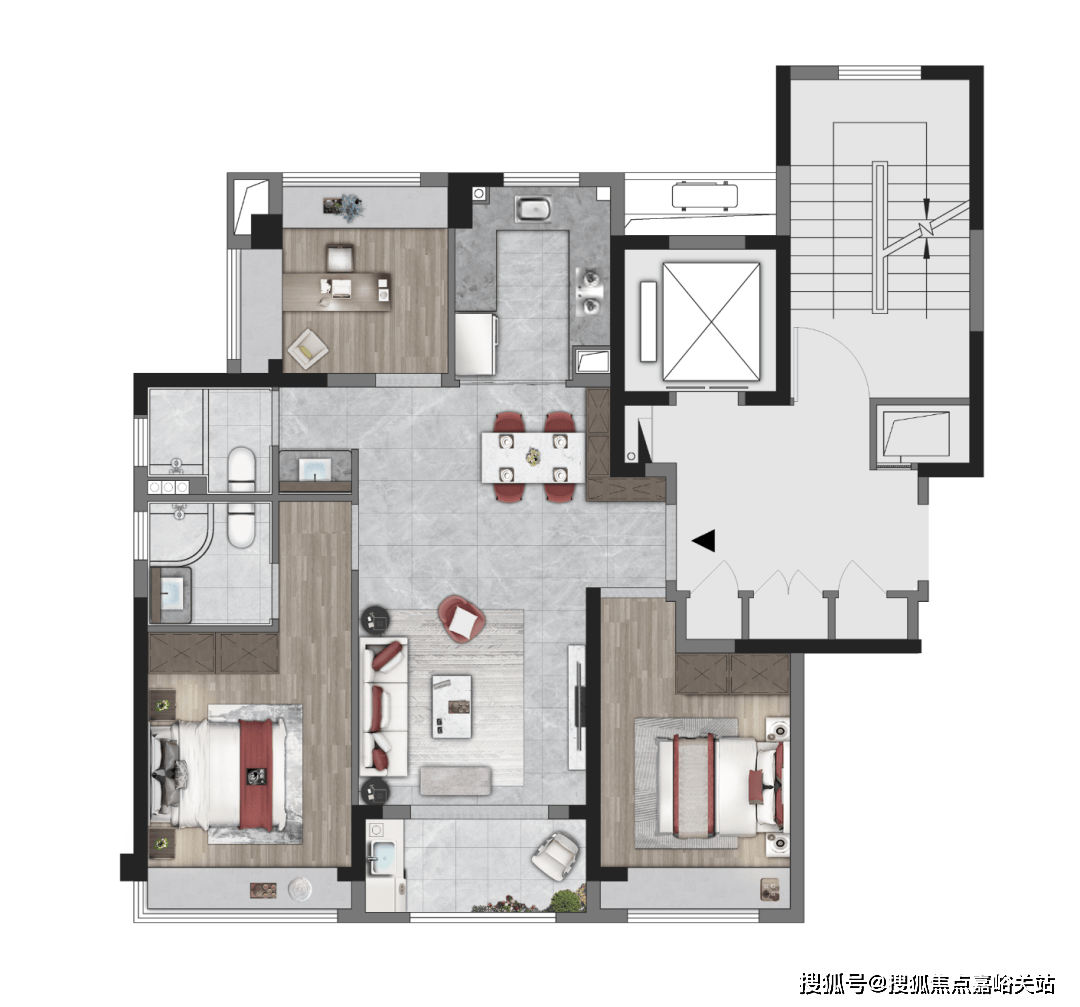 从入口连系中国保守府邸的空间礼序规制,“门庭”采用中国古典建建形制的斗拱布局做为粉饰,尽显东方诗意。入口松石相抱,连系特色跌水水景、精选制型树等,再加上入口台阶的设想,营制出更具质量感、卑贱感的江南大宅抽象。于此便可步入展现核心,正在最高处能够瞭望到一全面积达约240㎡的水景,仿佛镜面般波光粼粼的水景,正在将来交付后也将成为业从的日常。