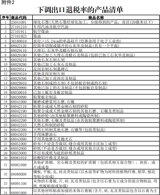 二是:将部门产物的出口退税率由13%下调至9%,好比成本油、光伏,电池、部门非金属矿物成品。