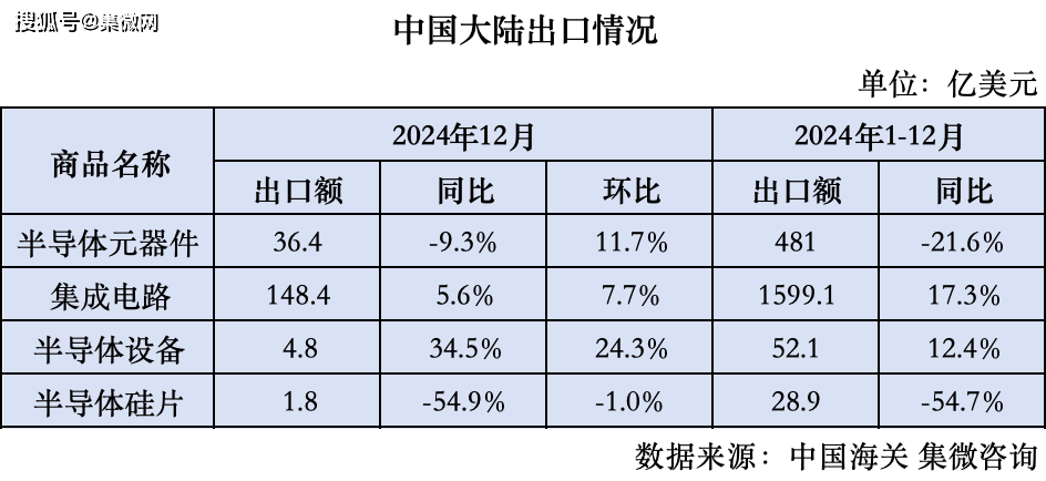 1-12月,中国半导体器件出口金额481。0亿美元,同比削减21。6%;集成电出口金额1599。1亿美元,同比增加17。3%;半导体设备出口金额52。1亿美元,同比增加12。4%;半导体硅片出口金额28。9亿美元,同比削减54。7%。
