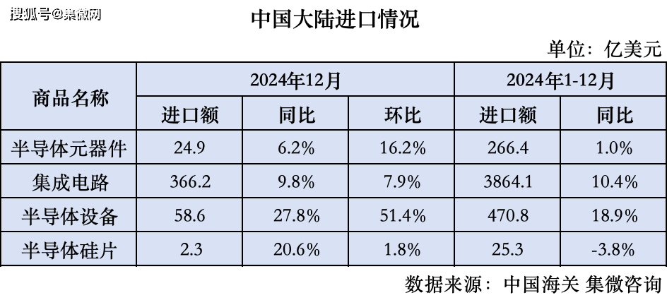 2024年1-12月,中国半导体器件进口金额27。62亿美元,集成电进口金额943。37亿美元,半导体设备进口金额175。73亿美元,半导体硅片进口金额30。62亿美元。12月,中国半导体器件进口金额2。45亿美元,集成电进口金额96。27亿美元,半导体设备进口金额21。80亿美元,半导体硅片进口金额2。57亿美元。