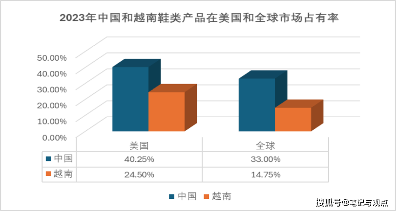 中国的制鞋财产仍是全球最大的鞋类产物出产和出口国,2021-2023年间,其出口金额稳居世界第一,但市场拥有率有所缩窄;而跟着越南出口到美国和全球市场的鞋类产物不竭增加,其市场拥有率较着添加。