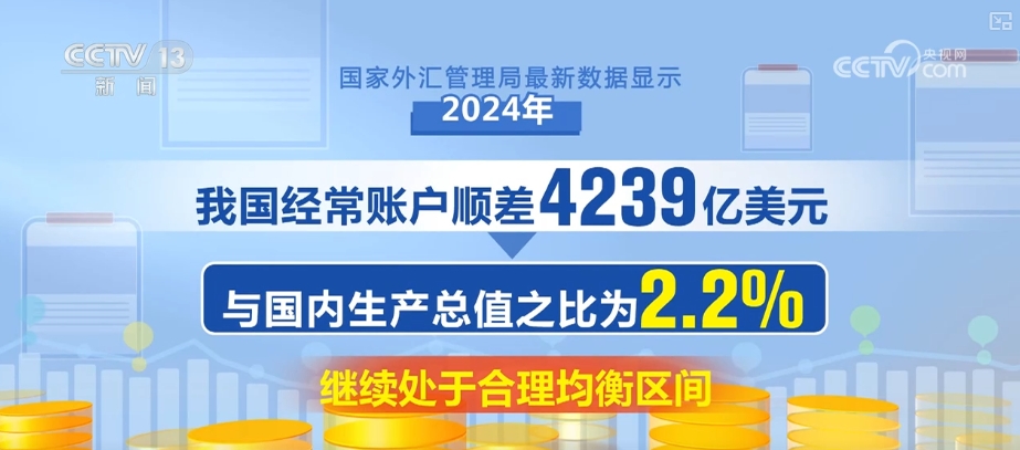 国度外汇办理局最新数据显示,2024年,我国经常账户顺差4239亿美元,取国内出产总值之比为2。2%,继续处于合理平衡区间。外商间接投资本钱金新增909亿美元,我国对外净资产为3。3万亿美元,增加15。6%。